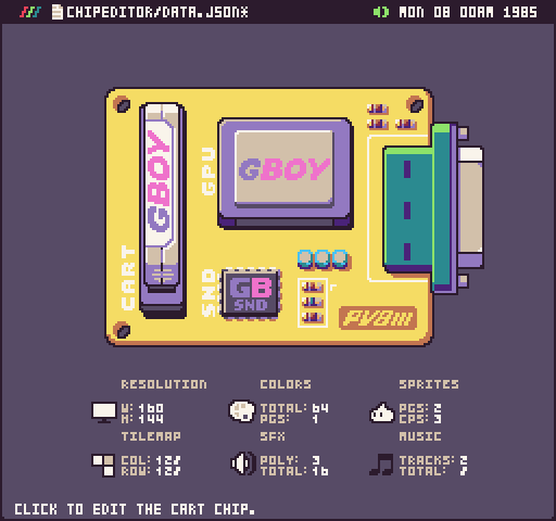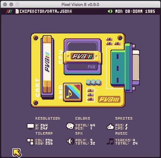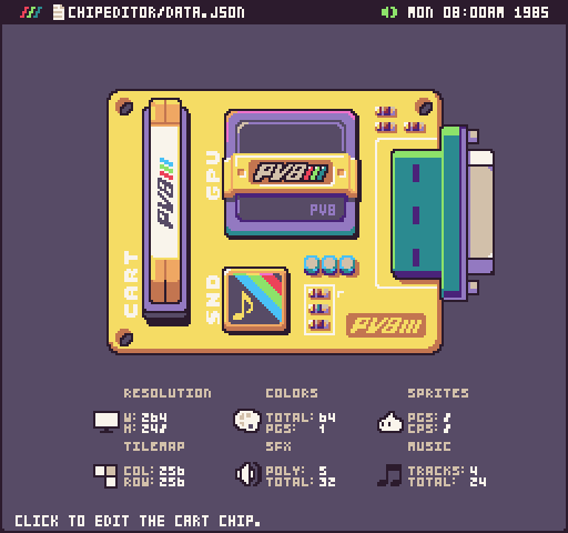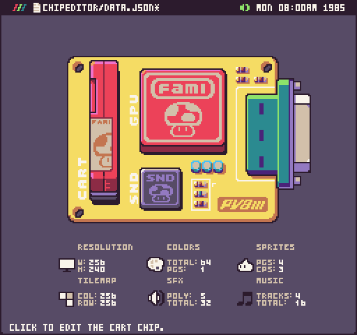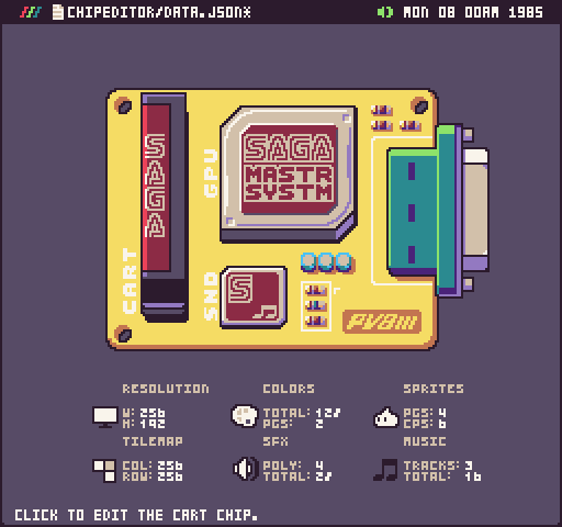 @CastPixel and I have been planning this tool for a very long time. At the core of Pixel Vision 8, is the concept of being able to customize the system specs to make your Fantasy Console. This is the feature that sets PV8 apart from the competition. While other Fantasy Consoles allow you to tweak a few settings here and there, PV8's new Chip Editor offers you complete control over every property of the underlying engine's chips. To make things easier, we've added pre-defined templates from famous 8-bit consoles.