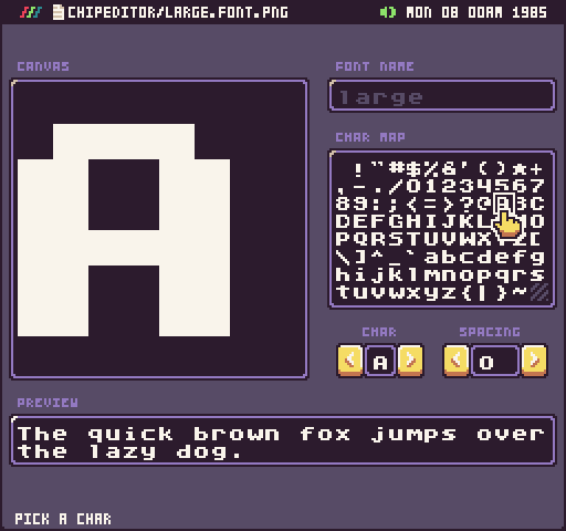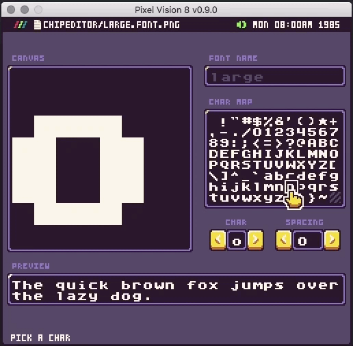 You may have noticed that I didn't release an alpha of Pixel Vision 8 v0.9.0 last month. That's because I felt it was best to continue to get everything cleaned up and release it when it's ready. That being said, I am still hard at work on PV8, and I've got two new tools to share with you. The first is a tool to edit fonts.